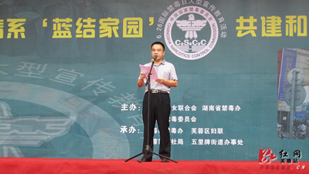 区委常委、政法委书记、禁毒委常务副主任刘熙宇发表热情洋溢的致辞。他总结了芙蓉区近年来的禁毒工作成果并提出未来禁毒工作方向,并向湖南省三湘南湖大市场实业总公司授“蓝结家园”牌匾。大会宣读了“情系蓝结家园 共建和谐芙蓉”倡议书,倡议全社会广大群众“珍爱生命,远离毒品;积极就业,自食其力”。