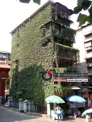 (长沙市芙蓉区朝阳一村31栋,楼房西面外墙上被绿色的爬山虎铺满了。 图/潇湘晨报滚动新闻记者 黎棠 实习生 冯春进)