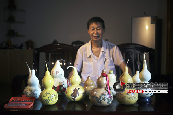 红网长沙8月15日讯 长沙芙蓉区教室二村小区有位“葫芦爹爹”,自己种葫芦,然后经过晾晒、雕刻,龙凤、老虎都“飞到”了葫芦上。“葫芦爹爹”叫李至善,退休前是化学教师,没有美术底子,看到电视上有人在葫芦上作画,李至善也有了兴趣,自己琢磨着在葫芦上刻画。五六年时间里,李至善做了上百个刻画的葫芦。
