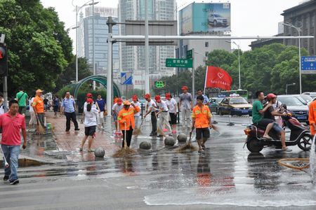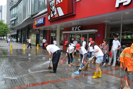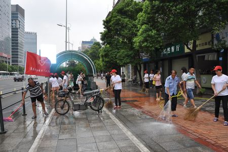 各个社区的志愿服务队的红旗在五一大道上迎风飘扬,志愿者们手拿卫生工具,对路面、绿化带及沿街垃圾等进行清洗,对公共场所的“牛皮癣”进行清除。