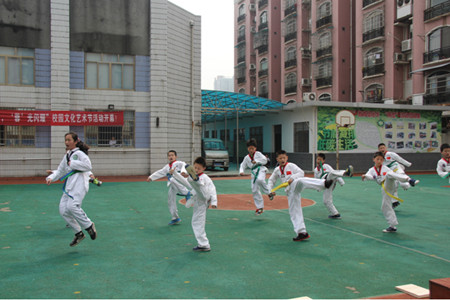 跆拳道——拳脚生风重礼仪 蓉园小学作为跆拳道的教育基地,在传教跆拳道技艺的同时,也为蓉园学子们传授了跆拳道礼、义、廉、耻、忍耐、克己、百折不屈的竞技精神。跆拳道中级班的同学们为大家带来的一套实战攻防术赢得了在场观众的喝彩。
