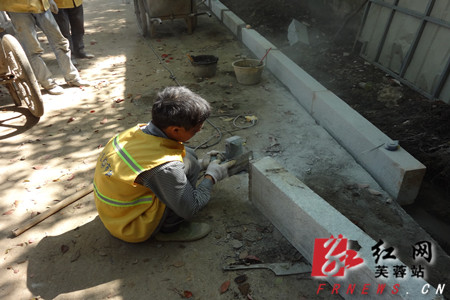 市政工人在火星二小出入通道加装侧石