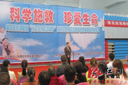 红网芙蓉站5月6日讯(通讯员 黄晶晶)为进一步普及居民应急救护日常知识,提升计卫合作水平,5月5日,东湖街道办事处在湖南生物机电职业技术学院内举办了“科学施救珍爱生命”——芙蓉区东湖街道“计卫合作应急救护”演练暨首期应急救护志愿者培训开班仪式。芙蓉区政府副区长、芙蓉区红十字会会长张庆和、芙蓉区卫生局纪检组长陈莉、芙蓉区红十字会办公室主任刘艳出席了本次活动,东湖街道办事处全体班子成员、湖南省马王堆医院和东湖街道社区卫生服务中心的医护人员及辖区内150余名居民参加了此次活动,活动由东湖街道办事处副主任、主任科员刘光明主持。