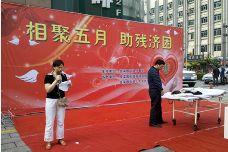 红网芙蓉站5月14日讯 (通讯员 雷达理)为大力弘扬人道主义思想,形成扶残助残的良好社会风尚。5月13日上午9点,韭菜园街道在通程万惠超市前坪举行了主题为“相聚五月助残济困”的大型活动,市残联副调研员任铁强,区政协副主席杨爱斌,区残联理事长颜剑波,区红十字会办公室主任刘艳以及韭菜园街道办事处工委书记徐青春、办事处主任王庄出席了活动。