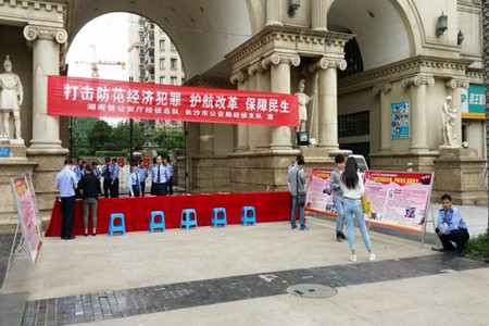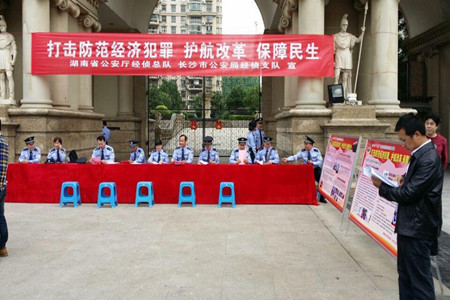 红网芙蓉站5月15日讯 (通讯员 杨洁)5月15日上午9时,东屯渡街道扬帆社区联合湖南省公安厅经侦总队、长沙市公安局经侦支队在世嘉国际华城小区前坪开展了以“打击防范经济犯罪、护航改革、保障民生”为主题的“5.15”大型街面宣传活动。省公安厅经侦总队支队长张波、市公安厅经侦支队政委李方艳、副政委兼纪委书记冯旗、副支队长郑志在东屯渡街道扬帆社区书记刘化祥、刘斌,社区主任周凤球等人的陪同下参与了此次活动,活动还邀请了相关部门和媒体等11个单位共同开展,以确保宣传活动的范围广,影响大、声势强。