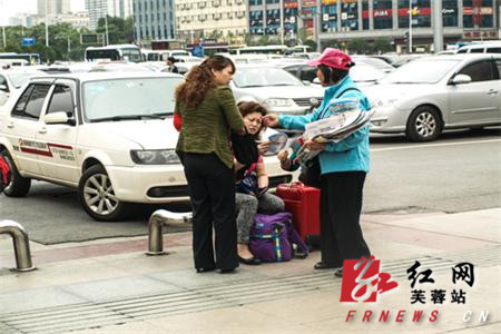火车站社区志愿者向过往旅客赠送防灾减灾知识宣传扇