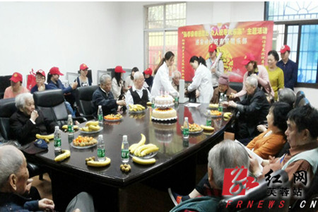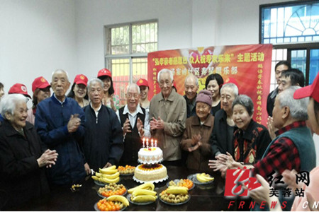 这是汤家岭社区服务银行的党员志愿者们自发成立的寿星俱乐部,今天是专门为12位90岁以上的老人举办集体生日宴会。据社区主任周紫微介绍,这12位老年人加起来年龄1127岁。96岁的米嗲嗲最年长,他虽然言语不多,但精神矍铄,腰板硬朗;94岁的曾嗲嗲精、气、神十足,思路清晰,谈吐自如,语言恢谐幽默,他代表众寿星发表热情洋溢的讲语,发自肺腑地说他的长寿归功于党的政策好!自己生活好!心情愉快好!社区服务好!曾嗲嗲的话语不时流露着自己的幸福生活,感感染着在场的每一个人,围观的群众啧啧称赞。“社区服务好”这句话让我不禁想到社区做出 “孝”的榜样。