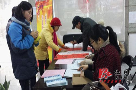 活动现场,湖南省图书馆书法家协会文化志愿者挥毫泼墨,创作了一幅幅春联饱含新年祝福的春联,社区工作人员和未成年人将写好的春联送到居民家里,并为行动不便的老人、残疾人贴好春联。