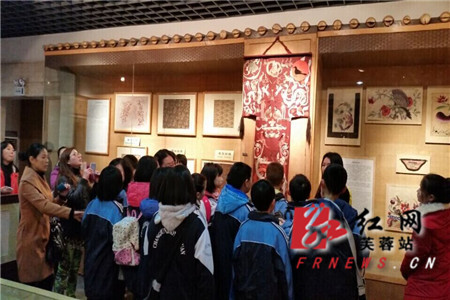 省湘绣博物馆资深讲解员带领着同学们一一参观了湘绣作品展柜、绣品制作间、绣女工作室,并进行了耐心的湘绣知识讲解,“湘绣主要以纯丝、硬缎、软缎、透明纱和各种颜色的丝线、绒线绣制而成。其特点是:构图严谨,色彩鲜明,各种针法富于表现力,通过丰富的色线和千变万化的针法,使绣出的人物、动物、山水、花鸟等具有特殊的艺术效果。”随着一幅幅惟妙惟肖、美轮美奂的湘绣作品的展出,看着绣女们精湛的绣工针法,同学们叹为观止,静静地体会湘绣艺术的精美。