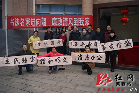 听说书法名家要来,许多居民早早来到现场。中国书法家协会会员、原湖南省书协副主席、长沙市书协主席谭秉炎;长沙市文联专职副主席、长沙市书协副主席李小军;中书协会员、书法教授贾铎;中书协会员、西泠印社会员张建民;中书协会员、湖南省书法教研会副主席李运良等书法家一出现,就受到“粉丝”们的热捧。短暂准备后,在一字排开的长桌前,书法家们开始泼墨挥毫,为居民朋友现场题写春联,一幅幅以社会主义核心价值观主题的春联在大家的惊叹声中即席挥就,行、隶、草等多种书体各显神韵。“强国富民宗法治,忠诚守信本和谐”、“依法治国反腐败,振邦安民图富强”……核心价值观依托春联这一传统文化载体实现了在基层的落地生根。