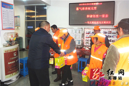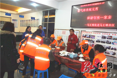 红网芙蓉站3月5日讯(通讯员 邓朋 丁玲) “大家辛苦了!”“来,我们干一杯!” 3月5日上午,在声声问候和祝福中,马王堆街道马王堆社区邀请环卫工人开展“喜气洋洋闹元宵,和谐邻里一家亲”活动,社区汉道工作室的志愿者们 “众筹”为社区多名环卫工人送上了爱心满满的元宵宴。