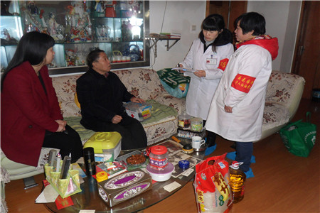 “慢性病患者”老党员肖继祖,患有尿毒症,每个礼拜都要到旺旺医院进行透析。街道社区卫生服务中心医务人员通过此次活动,为肖嗲嗲建立了健康档案,送上了家庭常用药箱,登记了日常用药情况,并承诺将每月免费为他进行一次上门体检。同时,还为老人送上了米、油等慰问物品,老人十分感动、连声道谢!