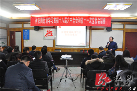 红网芙蓉站11月24日讯 (通讯员 徐跃飞)11月24日上午,荷花园街道组织全体机关干部及社区相关人员,召开学习贯彻党的十八届六中全会精神宣讲报告会。中共长沙市委讲师团机关党支部书记梁海刚到场授课,传达学习了党的十八届六中全会精神以及省委、市委、区委抓贯彻落实的有关要求。荷花园街道组织委员裴鸿志主持会议。