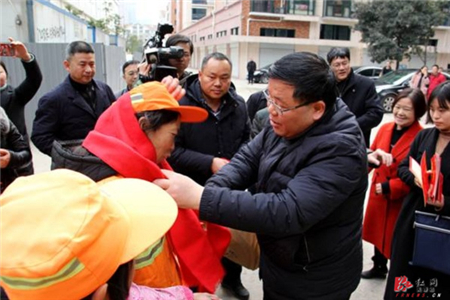 “环卫职工同志们,新春佳节即将来临,你们仍坚守岗位,为市民创造了一个清洁优美的城市环境,让大家高高兴兴过年,同志们辛苦了!你们工作很辛苦,任务很艰巨,你们不畏脏和累,你们的事业非常光荣,今天带来省委、省政府给大家的一份心意,祝大家新年愉快、阖家欢乐、万事如意!”徐文龙亲手为在场的环卫工人送上慰问物资,带上暖暖的红围脖,“大家辛苦了,现在天很冷,带上它会暖和的!”暖心的关怀让现场环卫职工感动不已。