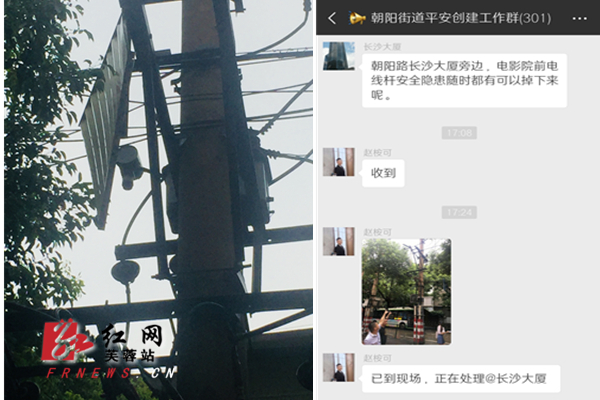 红网时刻长沙8月16日讯(通讯员 陈淑玲)8月15日15时30分左右,长沙市区遭遇了一场狂风暴雨。朝阳街道安监站的工作人员在朝阳街道平安创建工作群里提醒各社区、各企业做好雷雨天气的安全巡查,防范事故。随后,一条微信让安监站的工作人员心头一紧。“长沙大厦旁边、电影院前电线杆有安全隐患,随时都有可能掉下来。”此时快到下班高峰期,安全隐患不容忽视。