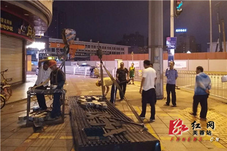 红网时刻长沙8月20日讯(通讯员 邹青青)违规户外广告不但严重影响市容环境,而且还存在安全隐患。为进一步规范户外广告秩序,提升城市形象,8月19日晚,五里牌街道城管办联合城管执法中队、社区、环卫所以及网格化员,共计20余人,对辖区内五一大道8号科佳美食城外墙违规墙体招牌进行专项拆除整治。