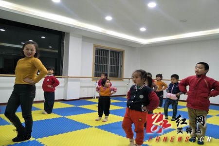 孩子们跟着老师学习舞蹈动作。