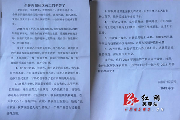 红网时刻长沙1月4日讯(通讯员 朱红伟)“孩子们!你们心中装的是尽职、尽力的心态......你们付出的汗水,每一份真诚,居民都看在眼里,都不会白费......”新年伊始,长沙市芙蓉区朝阳街道向韶社区的工作人员收到了一份特别的新年礼物——向韶村57栋居民胡芳连的感谢信。