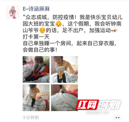 红网时刻长沙2月6日讯(通讯员 王思雯 章博)新型冠状病毒感染的疫情蔓延以来,长沙市芙蓉区火星街道曾家坪社区的居民积极配合社区防疫工作,纷纷宅在家中,自觉减少外出活动次数。但是近日,有家长在微信群里无奈表示:“宅在家都快要‘发霉’了,孩子想要外出活动。”2月6日,曾家坪社区联合快乐宝贝幼儿园开展了“宅家战‘疫’,不负时光”活动,每天相约在班级群里与老师互动,让孩子在家宅得住、宅得开心。