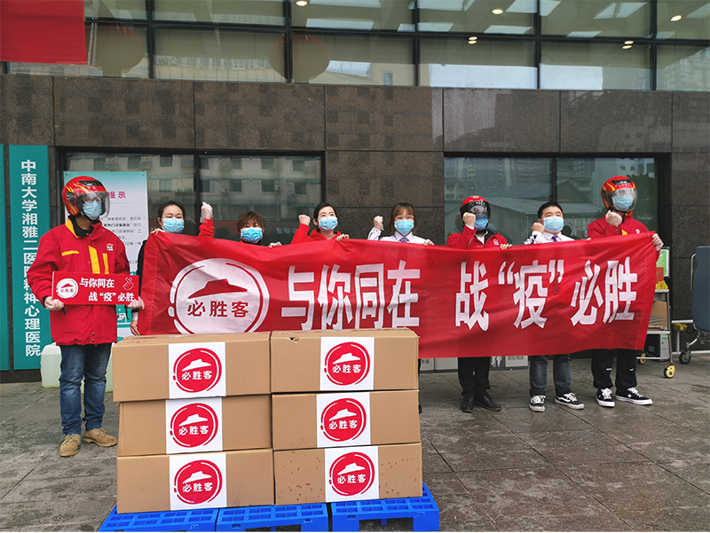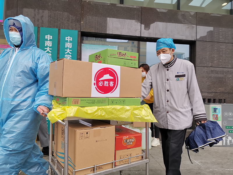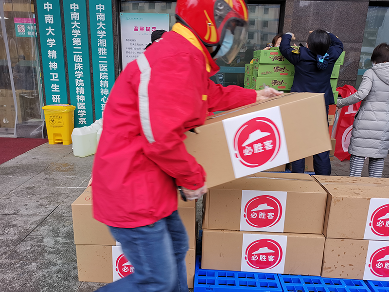 必胜客工作人员将爱心物资送到中南大学湘雅二医院。