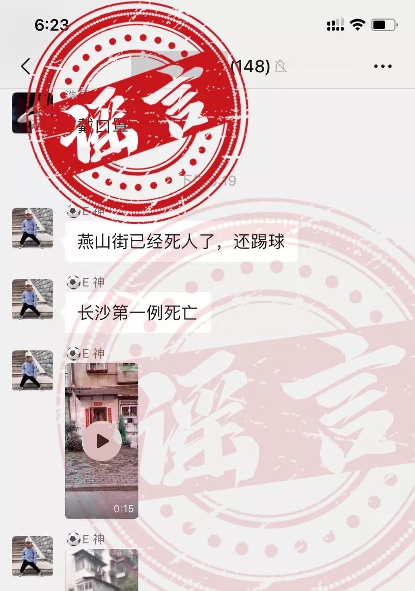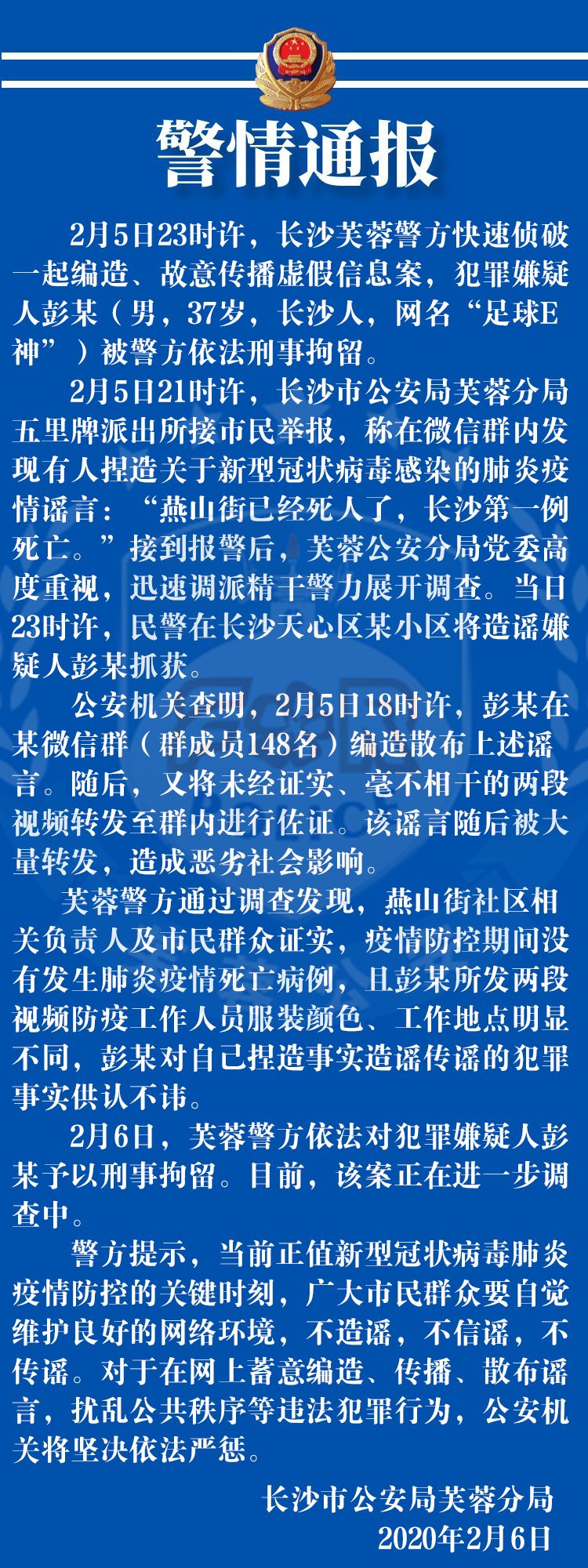 —分享— 2月5日23时许,长沙芙蓉警方快速侦破一起编造、故意传播虚假信息案,犯罪嫌疑人彭某(男,37岁,长沙人,网名“足球E神”)被警方依法刑事拘留。嫌疑人彭某。彭某在微信群内散布不实谣言。 来源:芙蓉区融媒体中心 编辑:陈佳卉