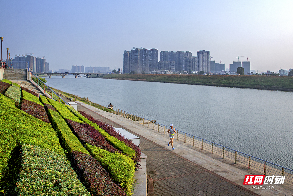 图:天蓝碧绿水清的浏阳河风光带沿岸。