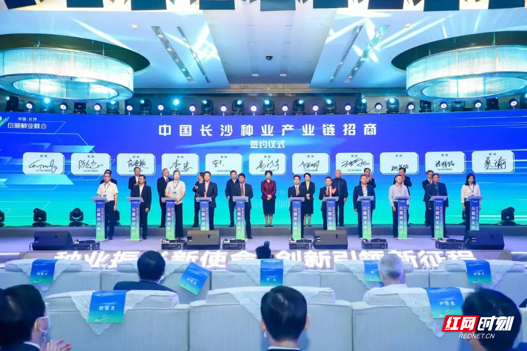 现场签约环节,湖南省科技厅与中国农村技术开发中心举行了“100+N”战略签约,岳麓山种业创新中心与中信农业、华智生物、湖南大学国家超算长沙中心等签署了共建协议,隆平高科技园与先正达集团、日本三井物产、北大荒垦丰种业、国药种业等企业签署了种业产业链招商协议。